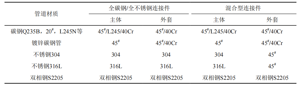 (2)連接件主體材質(zhì)硬度和其他參數(shù)值需高于或等于管道材質(zhì)硬度和其他參數(shù)值(表 1)。