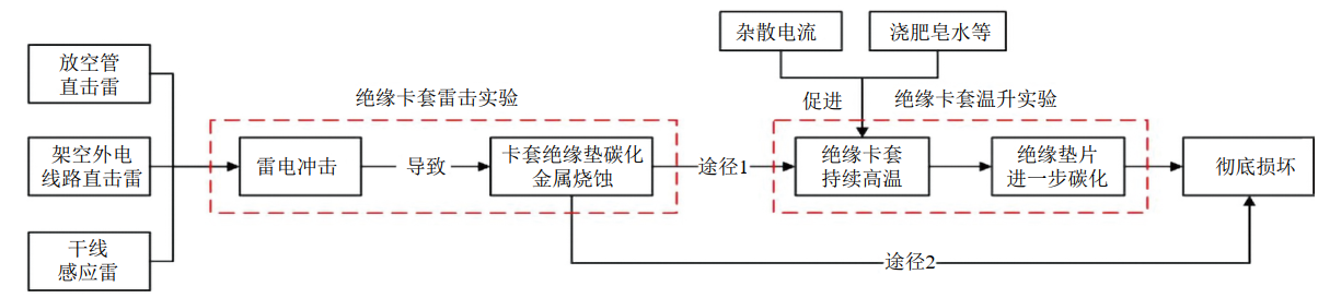 為了模擬絕緣接頭失效過程,進行了DK-LOK絕緣接頭標準雷電波沖擊實驗。結(jié)果表明,17 kA以上級別的標準雷電沖擊可以擊穿DK-LOK絕緣接頭,發(fā)生絕緣墊碳化和金屬燒蝕。其燒蝕機理如圖 2所示,閥室處的直擊雷、管道干線感應(yīng)雷可能對絕緣接頭造成損傷。絕緣接頭碳化后,低雜散電流干擾強度可以導(dǎo)致絕緣接頭劇烈升溫,進一步碳化直至徹底損壞。