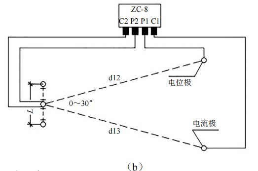 (1)接地電阻測試。采用三角形布極法測量接地系統(tǒng)的接地電阻。如圖 2 a所示,在土壤電阻率較均勻的地區(qū),d13取2 L,d12取L;在土壤電阻率不均勻的地區(qū),d13取3 L,d12取1.7 L(圖 2 b)。測量過程中電位極沿接地體與電流極的連線移動(dòng)三次,每次移動(dòng)距離為d13的5%左右,若三次測試值接近,取其平均值作為長接地體的接地電阻值;若測試值不一致,將電位極往電流極方向移動(dòng),直至測試值接近為止。長接地體的接地電阻也可以采用圖 2所示三角形布極法測試,此時(shí) d13= d12≥2 L。