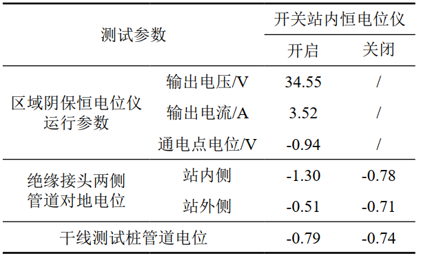 圖 3和表 1以西部某原油管道出站絕緣接頭內(nèi)外側(cè)電位測(cè)試數(shù)據(jù)為例,依次判斷區(qū)域陰極保護(hù)系統(tǒng)和線路陰極保護(hù)系統(tǒng)的相互干擾情況。