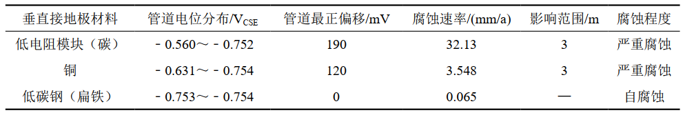 表 1 垂直接地極材料對管道電位和管道腐蝕的影響