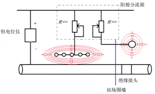 在泵棚區(qū)、閥組區(qū)增設(shè)淺埋陽極并入現(xiàn)運行的恒電位儀輔助陽極,通過提高恒電位儀輸出電流,進行多路陽極分流保護,從而提高該區(qū)域的陰保電流分布均勻性。