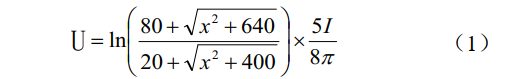 參比電極受到干擾將造成陰保數(shù)據(jù)收集不準(zhǔn)確,恒電位儀輸出不穩(wěn)定最終造成陰極保護(hù)系統(tǒng)失效。受周邊復(fù)雜空間電場影響,參比電極存在明顯的直流干擾。采用由遠(yuǎn)及近,再由近至遠(yuǎn)的方式測量并行管道參比電極測點(diǎn)處電壓偏移值并進(jìn)行定量分析,結(jié)果如圖 2所示。建立空間電場變化對參比電極干擾模型如圖 3所示。