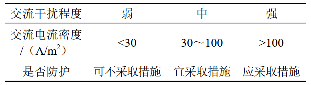 當(dāng)干擾程度評(píng)價(jià)為“中”或“強(qiáng)”時(shí),應(yīng)采取排流防護(hù)措施或提出消除交流干擾建議。