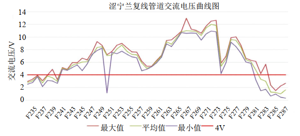 從圖 4 看出:該管段內(nèi)F243#—F282#區(qū)段平均交流電壓超過(guò)4 V;其余均小于4 V,交流干擾程度為“弱”。