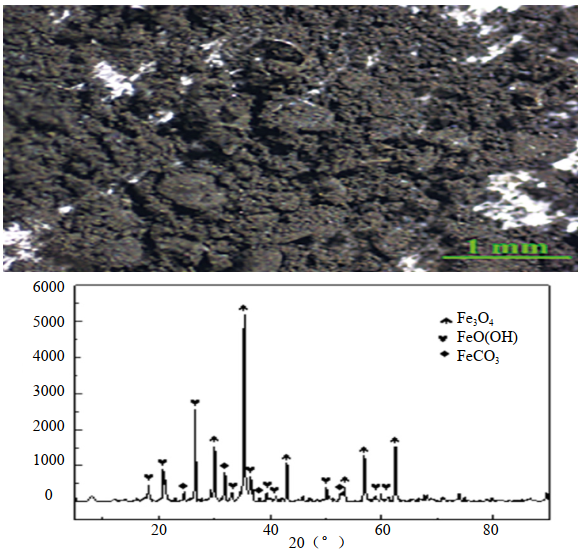 (4)磁性晶體粉末影響檢測器運行。使用體視顯微鏡(Zeiss Stemi 508)觀察黑色粉末宏觀形貌等,可見粉末細微,少量粉末團聚成球狀;使用X射線衍射儀分析其成分,主要成分為Fe3O4,F(xiàn)eO(OH)和FeCO3,如圖 5所示。Fe3O4為具有磁性的黑色晶體,漏磁檢測器若去掉漏磁探頭就是一個具有超強磁力的鋼刷清管器,在其運行過程中,兩側鋼刷將管道內壁金屬氧化物刷下來,一部分吸附在漏磁探頭兩側的強磁鐵上,一部分堆積在檢測器前段,使得漏磁檢測器需要比正常0.2 MPa壓差更大的驅動力。磁性氧化物粉末細微,硬度高,對皮碗的磨損嚴重。