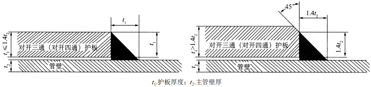 (1)三通焊接。嚴格按照GB/T 28055―2011要求定位三通安裝間距,測量三通環(huán)焊縫位置的管道實際壁厚,結(jié)合標準給出的許焊壓力計算公式再次計算確認焊接位置。焊接前必須進行焊接工藝交底,焊接過程嚴格執(zhí)行焊接工藝規(guī)程,落實預(yù)熱、多排多道、單層焊接厚度、回火/退火焊道等要求,保證焊接質(zhì)量,預(yù)防焊接裂紋,減少應(yīng)力集中。直焊縫焊接應(yīng)加墊鐵以保護管道不與電弧直接接觸;兩端加引護板并在焊接完成后切除,避免在三通本體上引弧和收弧,有利于減少缺陷產(chǎn)生。環(huán)焊縫焊接時嚴格按照SY/T 6150―2017和焊接工藝要求控制角焊縫的焊角尺寸(圖 4),既要保證焊縫強度,同時還要盡量降低焊縫位置的應(yīng)力集中。