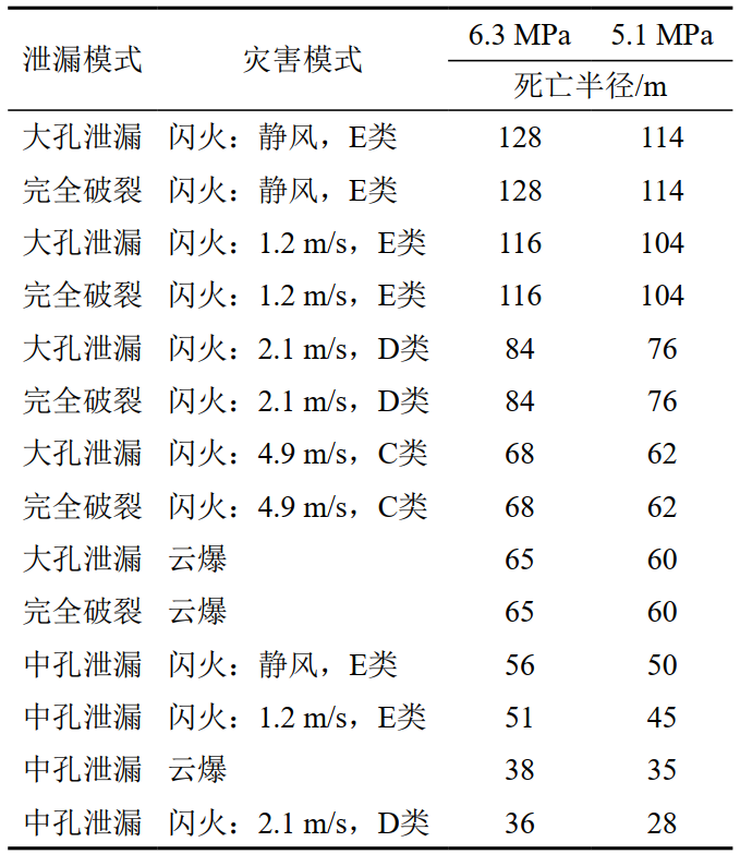 對比表 1結(jié)果可知,降壓運(yùn)行后管道模擬中孔、大孔、完全破裂事故后果影響死亡半徑減小了5 m~14 m不等,與潛在影響半徑變化情況大致吻合。就該案例管道,降壓運(yùn)行后事故狀態(tài)仍將造成嚴(yán)重后果。