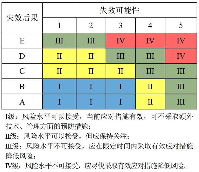( 2)降壓運(yùn)行后,事故發(fā)生概率進(jìn)一步降低,失效可能性仍取1;事故后果影響范圍有所減小,但在其影響范圍內(nèi)仍將造成大量人員傷亡,失效后果還取E;風(fēng)險(xiǎn)等級仍為III級,即較高級,風(fēng)險(xiǎn)不可接受。