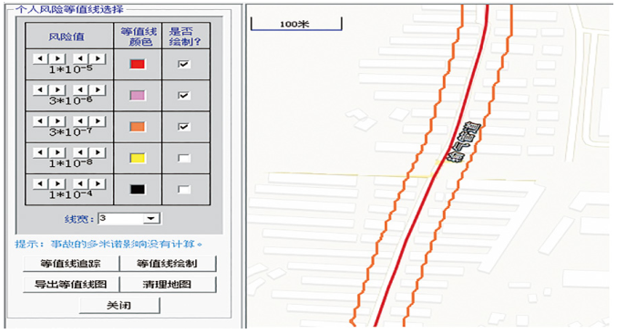 (1)未得到個(gè)人風(fēng)險(xiǎn)1×10-5次/年、 3×10-6次/年等值線。