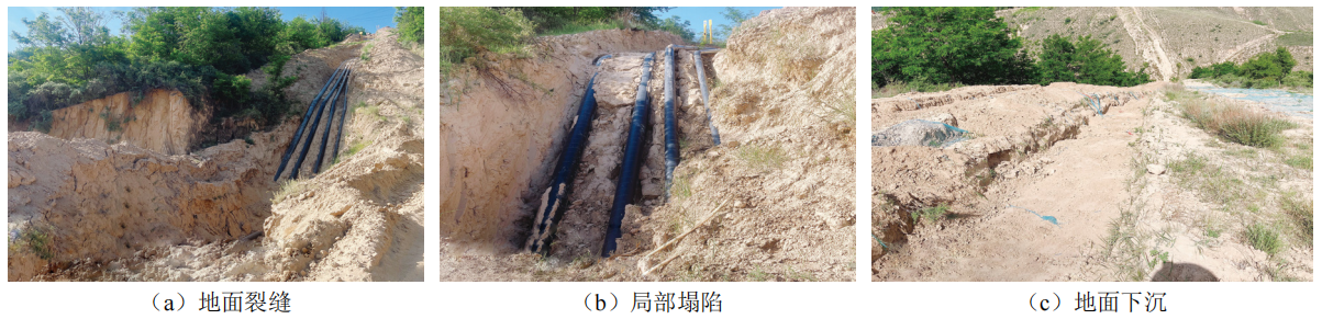 為了避免后期誘發(fā)地震及大面積塌陷,現(xiàn)代采煤技術(shù)在工作面回采過(guò)程中往往采用放頂措施,即工作面采完后讓煤層的頂部自然沉降。在沉降過(guò)程中,頂板受到覆蓋層的重力作用,從下到上依次將崩塌、變形傳遞到地表,導(dǎo)致地表形成大面積的裂縫(圖 1-a)、局部塌陷(圖 1-b)、下沉(圖 1-c)等地質(zhì)災(zāi)害。鋪設(shè)在上方的管道由于外力作用使原有的平衡被打破,往往出現(xiàn)拉伸、擠壓、剪切、扭轉(zhuǎn)、彎曲變形,甚至出現(xiàn)管道斷裂情況。