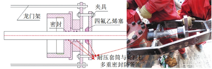 結合帶液壓缸的閘閥開啟結構形式,“以拉代旋”將中閥板拉拽出來。通過在閥門外部安裝龍門架,在絲杠外端部攻絲以延長連接外拉桿,利用桿將閥門絲杠和中閥板同時拉出方法打開閥門,完成安裝三通內(nèi)塞柄的工序。此方法要保證閥門內(nèi)腔的密閉性,操作全過程不得出現(xiàn)油氣介質(zhì)泄漏,對可能的泄漏點進行多重密封保護。