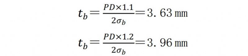 實(shí)際上,管道屈服以后管徑不斷增大。假設(shè)按管道10%和20%延伸率分別進(jìn)行計(jì)算,則管道爆裂的剩余壁厚分別為: