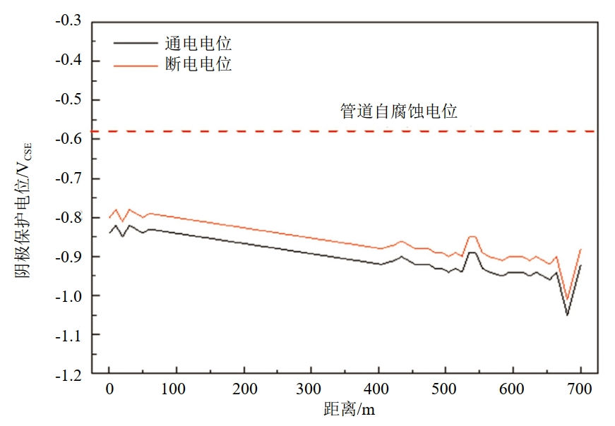 依據(jù)GB/T 21447―2008《鋼制管道外防腐控制規(guī)程》6.6.2、GB/T 21448―2008《埋地鋼制管道陰極保護(hù)技術(shù)規(guī)范》4.3規(guī)定。測(cè)試管道通電電位、斷電電位均滿足﹣0.85 VCSE的最小保護(hù)電位指標(biāo)或100 mV極化偏移指標(biāo)。因此判斷管道事故點(diǎn)西側(cè)殘留管段以西700 m范圍內(nèi)管道具備一定的陰極保護(hù)效果。