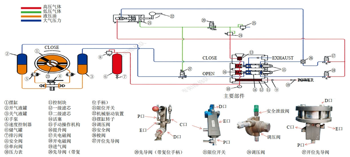 在遠程關(guān)閥時,電磁閥17通電閉合,紅色高壓氣體經(jīng)過梭閥26進入提升閥組件,高壓氣體推動提升閥活塞向左移動,錐形密封打開,高壓氣體進入關(guān)氣液罐,推動液壓油流向開氣液罐,擺缸轉(zhuǎn)子在液壓油的驅(qū)動下帶動球閥閥桿執(zhí)行關(guān)閥操作。