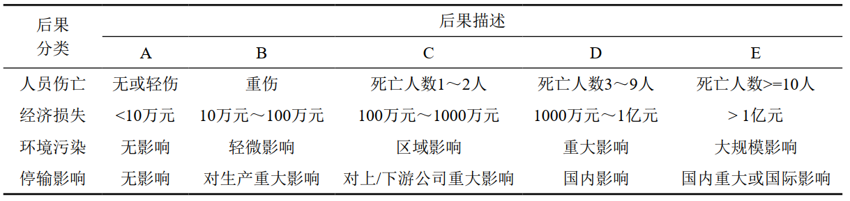 改進(jìn)要點(diǎn)包括:①采用地區(qū)等級(jí)劃分替代失效后果中人員傷亡人數(shù)的分級(jí)方法;②失效可能性分級(jí)中,增加了防護(hù)措施有效性等級(jí)劃分,如果風(fēng)險(xiǎn)點(diǎn)采取了針對(duì)性的防護(hù)措施,最終的失效可能性分級(jí)以主導(dǎo)風(fēng)險(xiǎn)因素發(fā)生可能性、防護(hù)措施有效性確定的等級(jí)中較高者為最終失效可能性等級(jí);③失效可能性分級(jí)中,明確指出應(yīng)以主導(dǎo)風(fēng)險(xiǎn)因素來(lái)劃分等級(jí)。