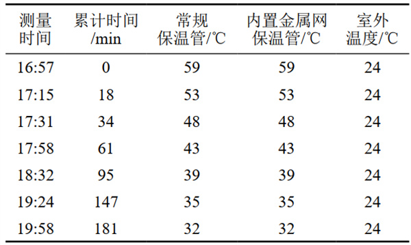 (1) 熱損失實(shí)驗(yàn)。現(xiàn)場(chǎng)模擬內(nèi)置金屬網(wǎng)對(duì)保溫管內(nèi)的熱損失實(shí)驗(yàn)(3小時(shí))結(jié)果證明,改進(jìn)保溫結(jié)構(gòu)后熱損失可以忽略不計(jì)(表 2)。