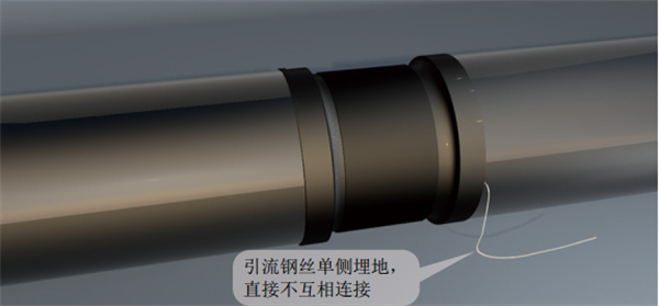 (2)焊接補(bǔ)口。焊接補(bǔ)口應(yīng)采用性能可靠、現(xiàn)場(chǎng)環(huán)境適應(yīng)性強(qiáng)、施工操作方便和技術(shù)經(jīng)濟(jì)性好的材料,補(bǔ)口順序依次為防腐層—保溫層—防護(hù)層,補(bǔ)口工藝參照原保溫管道。引流接地線要單側(cè)引出,管道之間的接地線不連接,如圖 9所示。