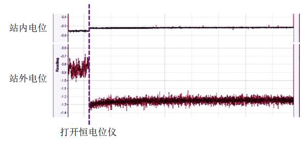 圖 1 站內(nèi)外電位隨恒電位儀開關(guān)機(jī)變化情況