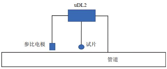 埋設試片時應盡可能保證與管道埋深相同,若現(xiàn)場開挖情況不允許,應至少保證埋設深度為50 cm。便攜式參比電極盡可能靠近試片埋設。測試接線如圖 1所示。