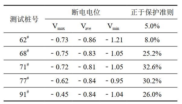 從表 1可知,5處測試樁處斷電電位正于 ﹣850 mVCSE的時間比例均遠大于標準規(guī)定的5%,地鐵雜散電流明顯影響了該段管道陰極保護的有效性,使管道處于欠保護狀態(tài)。