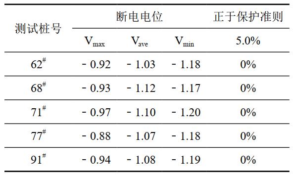 (2)電位檢測。排流治理后,再次對5處測試樁進行24 h通/斷電位檢測,陰保效果判定結果如表 2所示。