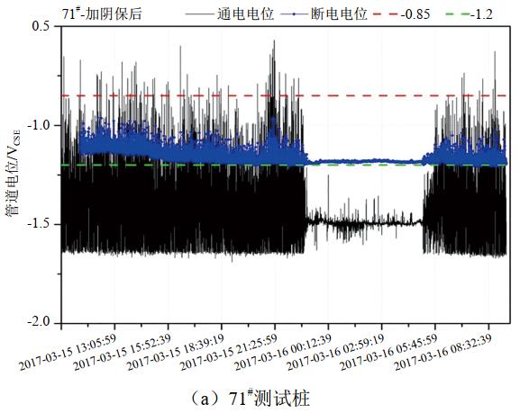 (3)通/斷電位波動幅度分析。71#測試樁14:29至20:02通電電位波動幅度為1.77 V(﹣2.00 VCSE~ ﹣0.23 VCSE),遠大于同時段斷電電位波動幅度0.33 V(﹣0.72 VCSE~﹣1.05 VCSE)。主要原因是受IR降波動影響。測試通電電位是管道和參比電極之間的管地電位,測試回路中存在土壤電阻率、部分涂層電阻率,當外界動態(tài)雜散電流I波動時,IR通隨之波動。測試斷電電位是斷電試片與參比電極之間的電位。雖然依舊存在動態(tài)雜散電流I,但是由于斷電試片離參比電極足夠近,且無涂層,R斷遠小于R通,則通電電位波動幅度遠大于斷電電位的。