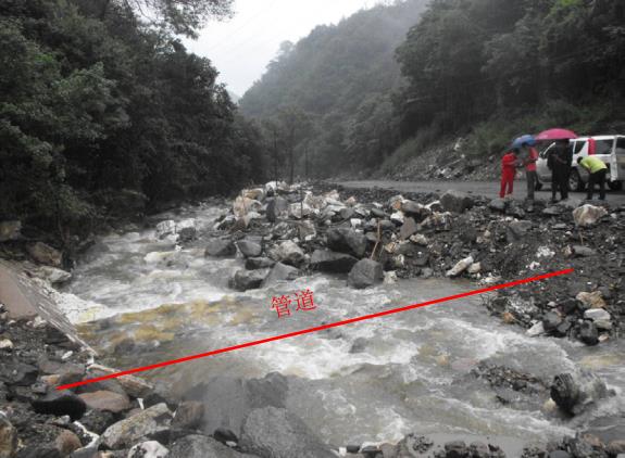 2010年7月,受連續(xù)大暴雨影響,關山溝泥石流爆發(fā),管道沿線水毀災害十分嚴重,許多地段公路邊溝破壞、護岸擋墻垮塌、過水路面不復存在,有600米管段多處受損。其中A穿越河流處,原采用護岸墻+圓管涵水工保護工程防護,管堤受板橋溝洪水垂直沖刷嚴重,洪水中夾帶有大量塊石造成管堤處原有圓管涵堵塞,塊石直接沖擊管道上方已形成寬約10米、深約5米的豁口,6米長露管,表面防腐層局部破損(圖 1)。