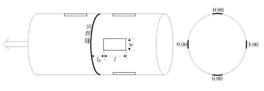 (1)應(yīng)力檢測(cè)。第一次超聲波軸向應(yīng)力檢測(cè)共測(cè)量了4處截面,截面位置如圖 1所示,每個(gè)截面上測(cè)點(diǎn)分布如圖 2所示。現(xiàn)場(chǎng)測(cè)量應(yīng)力最大值位于截面④的0點(diǎn)鐘方向,承受340 MPa的拉應(yīng)力,X65鋼材的屈服強(qiáng)度為450 MPa,強(qiáng)度比值為0.76。