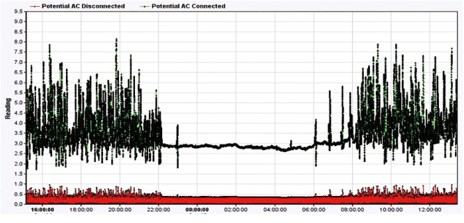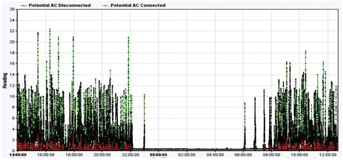 當(dāng)管道交流或直流電流密度很高時,陰極保護(hù)可能對交流腐蝕起不到緩解作用,反而偏負(fù)會加快交流腐蝕速率。建議管道在交流干擾情況下將陰保電位(消除IR降后)控制在﹣0.90 VCSE~﹣1.15 VCSE或直流電流密度≦1 A/㎡且EIR-free≦﹣0.9 VCSE。