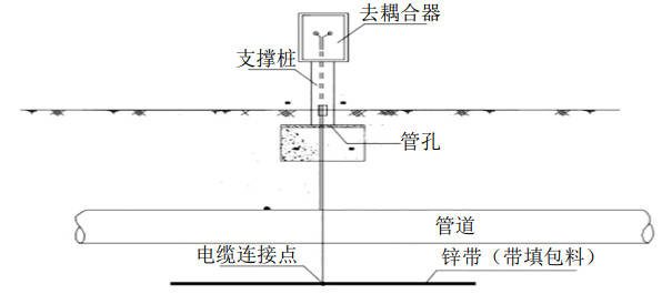 選用固態(tài)去耦合器+負(fù)極接地極兩種互補(bǔ)聯(lián)合排流方式,采用規(guī)格ZR-2帶狀鋅陽極作為接地體,根據(jù)現(xiàn)場土壤電阻率測試值,排流地床設(shè)置鋅帶100 m,與管道平行敷設(shè)(圖 5)。在76#~80#干擾嚴(yán)重管段沿線設(shè)置5處交流排流點,同時減小干擾管段上下游陰保站恒電位儀輸出,使該管段陰保斷電電位處于合理區(qū)間。排流檢測結(jié)果如表 3所示。