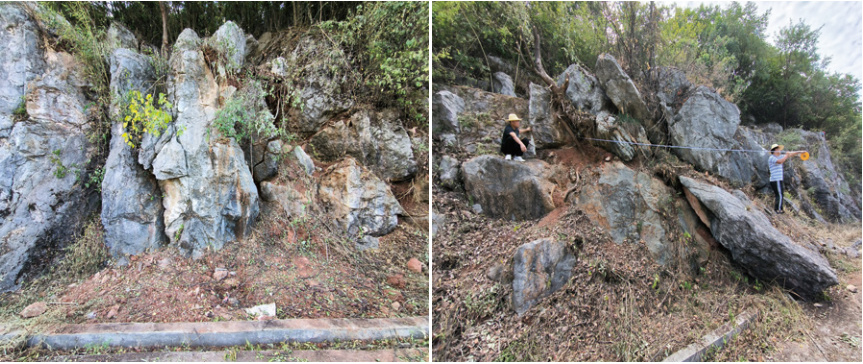 崇山段處邊坡原為自然坡形加削坡,植被茂密,雜草叢生,經(jīng)人工削挖坡建便道。坡上部分管段原砌有塊石擋墻,便道已水泥硬化,便道下埋石油管道和光纜,深度約為1.1 m~2.0 m。管道便道邊坡大致呈南北走向,長度約150 m,東邊緊鄰山體,高程約為18.0 m~60.0 m不等,最大坡角約45度。坡底(西側(cè)為水塘,面積約為10400 m2)高程約6.0 m~7.0 m。邊坡為永久性巖質(zhì)邊坡,破壞類型為滑移型,安全等級為一級,Ⅳ類巖體,較完整。2022年管道地質(zhì)災害排查過程中發(fā)現(xiàn),原建擋墻老化開裂,邊坡出現(xiàn)沖溝,巡護通道靠山側(cè)地面有多處危巖、落石(圖 1)。經(jīng)委托武漢中南冶勘資源環(huán)境工程有限公司進行現(xiàn)場勘察發(fā)現(xiàn),崇山段局部有巖溶、滑坡、危巖,邊坡中段因雨水沖刷導致小范圍垮塌,認定存在崩塌類地質(zhì)災害隱患。