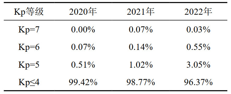 表 1 地磁暴等級(jí)占比時(shí)間( 2020—2022年)