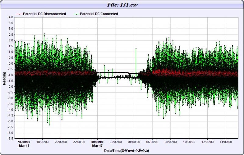 測試結(jié)果表明(圖 2),00:00—06:00時間范圍內(nèi)電位基本不變化,除此之外電位波動非常大,可以得出,電位波動、平穩(wěn)時間與地鐵運行時間高度吻合。因此,測試結(jié)果表明電位波動是由地鐵運行引起。