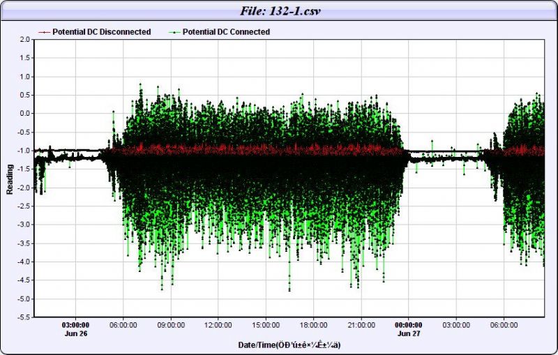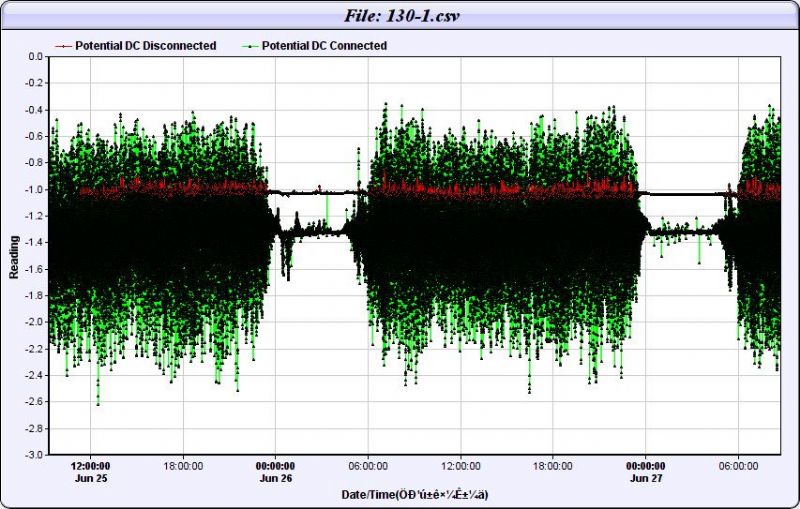 排流施工結(jié)束后,依舊采用UDL-2對管道長時間通/斷電位進行監(jiān)測,以此判斷排流地床有效性有了明顯改善(圖 3)。安裝排流地床后,3處測試樁斷電電位曲線明顯下移,電位正于﹣850 mV的電位占比低于5%,說明排流地床設(shè)計、施工達到預(yù)計要求。