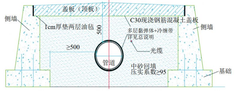 為滿足釋放載荷要求,蓋板涵基礎(chǔ)頂面需低于管底。為滿足后期維檢修要求,蓋板涵側(cè)墻與管道凈間距不宜小于1.5 m,蓋板涵頂板距離管頂不宜小于0.5 m,基礎(chǔ)、側(cè)墻和頂板的具體參數(shù)需根據(jù)現(xiàn)場情況進(jìn)一步核算。為避免形成密閉空間,蓋板涵內(nèi)部空間應(yīng)填充細(xì)砂,蓋板涵保護(hù)范圍應(yīng)延伸至道路用地紅線外3 m,并設(shè)置必要的警示標(biāo)識(圖 1)。