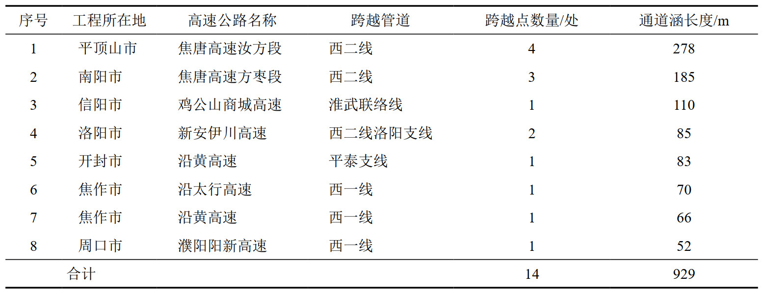 近兩年來,在相關(guān)單位友好協(xié)商的基礎(chǔ)上,通道涵已在河南省境內(nèi)的多條高速公路與西氣東輸管道交叉處獲得了應(yīng)用,累計避免了14處新增地理阻隔和929 m的填方占壓,為高速公路和長輸管道兩項重大基礎(chǔ)設(shè)施的和諧共生探索了有益經(jīng)驗(表 1)。