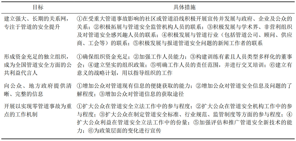 (1)完善公眾參與的管道保護(hù)機(jī)制。管道運(yùn)營商在法規(guī)和標(biāo)準(zhǔn)制定上具有一定的話語權(quán),但公眾目前很少參與到法規(guī)和標(biāo)準(zhǔn)制定中。因此需要組建一個由社區(qū)、監(jiān)管機(jī)構(gòu)、非營利組織、學(xué)術(shù)界和管道行業(yè)共同參與的管道保護(hù)組織,建立公眾參與的審查機(jī)制,制定共同的策略,解決相關(guān)方之間的利益糾紛,從而提高管道相關(guān)政策法規(guī)及政府監(jiān)管的執(zhí)行能力。
