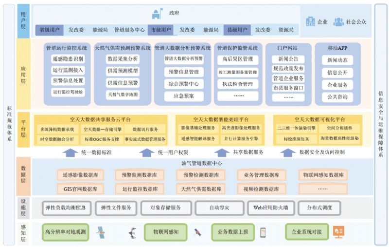 圍繞管道保護和資源保障監(jiān)督管理等環(huán)節(jié),集數(shù)據(jù)存儲、數(shù)據(jù)融合、遙感解譯、智能分析、綜合預警等功能于一體,匯聚了企業(yè)多源數(shù)據(jù)及遙感影像解譯等技術(shù),開發(fā)了包括油氣管道運行監(jiān)控、天然氣供需預警管理和大數(shù)據(jù)分析預警、管道保護監(jiān)管等應用系統(tǒng),以及門戶網(wǎng)站、手機移動端等內(nèi)容。