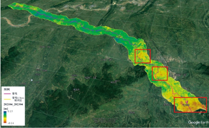 利用 InSAR 衛(wèi)星技術(shù)可對(duì)管道沿線(xiàn)進(jìn)行大范圍地質(zhì)風(fēng)險(xiǎn)篩查,快速獲取目標(biāo)區(qū)域的地形、地貌以及表面的微小變化,通過(guò)采集管道沿線(xiàn)區(qū)域多個(gè)時(shí)期的 SAR 圖像并進(jìn)行干涉分析,計(jì)算出地面沉降和地表形變的速率,生成形變速率專(zhuān)題圖,從而劃分出高、中、低不同的風(fēng)險(xiǎn)區(qū)域。