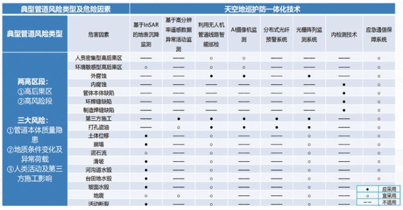 自今年5月應(yīng)用以來(lái),產(chǎn)生報(bào)警信息255條,結(jié)合現(xiàn)場(chǎng)核實(shí)不斷修正算法,總體的報(bào)警準(zhǔn)確率從40%提升至97%。成功預(yù)警突發(fā)第三方施工行為10次,成功監(jiān)測(cè)3段管道嚴(yán)重地面沉降(圖 2)。根據(jù)風(fēng)險(xiǎn)預(yù)警結(jié)果,制定11項(xiàng)重點(diǎn)業(yè)務(wù)管理看板。結(jié)合IMS系統(tǒng)動(dòng)態(tài)調(diào)整最優(yōu)巡查時(shí)間、巡護(hù)關(guān)鍵點(diǎn),優(yōu)化不同時(shí)段巡護(hù)任務(wù)414個(gè),累計(jì)設(shè)置60 049處關(guān)鍵點(diǎn)(遠(yuǎn)高于集團(tuán)每公里2個(gè)關(guān)鍵點(diǎn)的要求),確保風(fēng)險(xiǎn)點(diǎn)巡護(hù)到位。總結(jié)形成了風(fēng)險(xiǎn)管控技術(shù)矩陣表(圖 3),聚焦4類(lèi)管道、18種風(fēng)險(xiǎn),制定了“天基”衛(wèi)星、“空基”無(wú)人機(jī)、“地基”光纖、視頻AI監(jiān)測(cè)等9項(xiàng)技術(shù)的使用規(guī)程,編制天空地防護(hù)巡一體化技術(shù)體系標(biāo)準(zhǔn)。