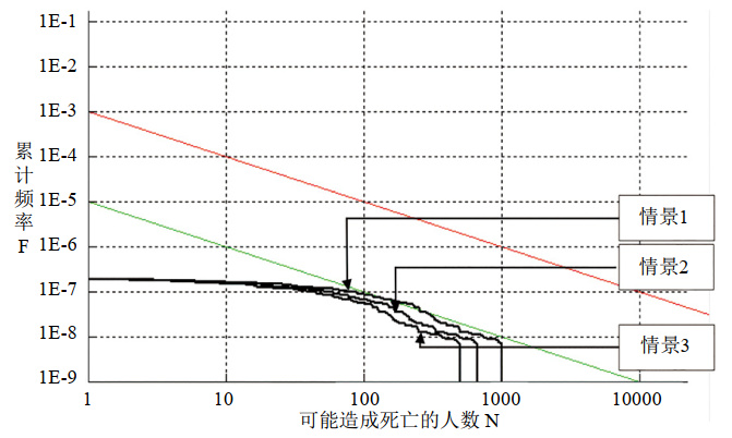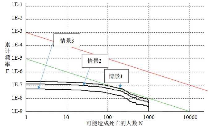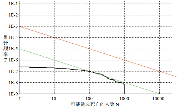 圖 2中紅線與綠線之間的區(qū)域表示可能造成死亡人數(shù)小于1000的區(qū)域?yàn)轱L(fēng)險(xiǎn)可接受區(qū)。紅線之上以及可能造成死亡人數(shù)大于1000的區(qū)域?yàn)椴豢山邮軈^(qū)。綠線之下以及可能造成死亡的人數(shù)小于1000的區(qū)域?yàn)轱L(fēng)險(xiǎn)可接受區(qū)。