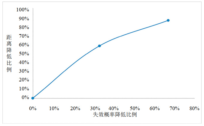 由表 2中數(shù)據(jù)結(jié)果可以看出降低失效概率可以有效降低個(gè)人風(fēng)險(xiǎn)和社會(huì)風(fēng)險(xiǎn),見(jiàn)表 1、圖 3。當(dāng)失效概率減小為原來(lái)的67%時(shí),3×10-6個(gè)人風(fēng)險(xiǎn)等值線距離管道的距離降低了57.95%;當(dāng)失效概率減小為原來(lái)的33%時(shí),3×10-6個(gè)人風(fēng)險(xiǎn)等值線距離管道的距離降低了86.18%。從圖4中可以看出失效概率與人風(fēng)險(xiǎn)等值線距離管道的距離呈正相關(guān)性,個(gè)人風(fēng)險(xiǎn)值與社會(huì)風(fēng)險(xiǎn)結(jié)果對(duì)管道失效概率值的變化都較敏感。
