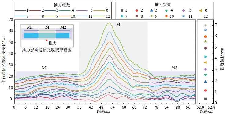 選擇一段廢棄的管道,開展土體位移狀態(tài)下光纜變形與管道變形相關(guān)性原位試驗。基本試驗思路是,在近管道邊側(cè)開挖作業(yè)坑,通過千斤頂水平方向給土體施加應(yīng)力(模擬滑坡的作用力),推動土體變形(模擬滑坡滑移變形),土體位移變形的過程中會帶動管道及光纜受力變形,同步監(jiān)測/檢測土體位移-管道應(yīng)變-光纜應(yīng)變(圖 5)。試驗最終得到管道的應(yīng)變曲線(圖 6)和伴行光纜應(yīng)變變化曲線(圖 7),分析兩者的應(yīng)變關(guān)系,可以得到如下幾點認(rèn)識:①土體位移/應(yīng)力作用下管道和光纜均出現(xiàn)明顯的應(yīng)變變化,應(yīng)變變化的形態(tài)相似,呈現(xiàn)出以推力作用為中心,中心高往兩側(cè)逐漸降低的應(yīng)變分布;②推力作用下,光纜和管道受力變形的范圍有放大效應(yīng),作用于土體推力的鋼板寬度為3.4 m,而在管道及光纜產(chǎn)生明顯的應(yīng)變變化的長度范圍約為30 m,相比于施加到土體上應(yīng)力作用寬度擴大了約9倍,這是點應(yīng)力在土體中呈扇狀擴散效應(yīng)的結(jié)果;③在同一外力作用下,管道的變形(應(yīng)變)量大于光纜的變形(應(yīng)變)量,如最后一級推力下管道中間位置的最大應(yīng)變值為300 με~350 με,相應(yīng)的伴行通信光纜的應(yīng)變值為180 με~200 με,后者約為前者的60%;④土體位移/應(yīng)力作用下光纜應(yīng)變響應(yīng)出現(xiàn)的時間早于管道應(yīng)變響應(yīng)出現(xiàn)的時間,也就是說光纜先于管道感知到外力的作用。
