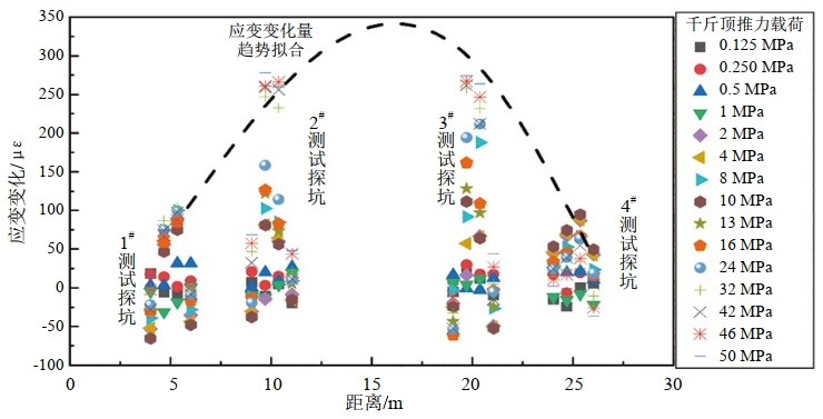 圖 6 原位試驗中不同級次推力作用下管道應(yīng)變變化