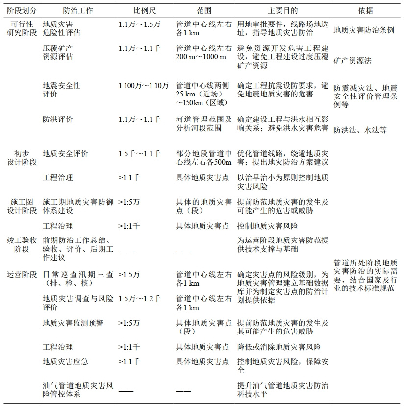 到2022年底,我國油氣管道總里程達(dá)18萬千米,已基本形成連通海外、覆蓋全國、橫跨東西、縱貫?zāi)媳薄^(qū)域管網(wǎng)緊密跟進(jìn)的油氣管網(wǎng)布局。“十四五”時(shí)期我國管道運(yùn)輸仍將處于高速增長期。與此同時(shí),近年來突發(fā)性強(qiáng)降水、臺風(fēng)等極端氣候事件增多,災(zāi)害發(fā)生的概率加大,致使油氣管道面臨的地質(zhì)災(zāi)害防治的總體形勢更加嚴(yán)峻。本文從油氣管道可行性研究、初步設(shè)計(jì)、施工圖設(shè)計(jì)、竣工驗(yàn)收、運(yùn)營等五個(gè)階段入手,綜合研究油氣管道全生命周期誘發(fā)、加劇、遭受地質(zhì)災(zāi)害威脅危害的可能性,避免和減少產(chǎn)生不良后果的基本方法,增強(qiáng)地質(zhì)災(zāi)害防治的針對性、時(shí)效性和科學(xué)性,提高油氣管道建設(shè)及運(yùn)行的地質(zhì)安全保障能力和水平(表1)。