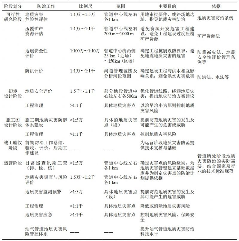 表 1 油氣管道全生命周期地質(zhì)災(zāi)害防治的主要內(nèi)容