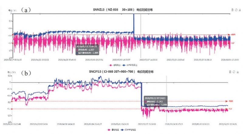 樁內(nèi)連接線常見故障有接線頭銹蝕、測試線損壞以及接線問題。日常管理中需要定期給接線柱和線頭進(jìn)行打磨處理,以確保接觸良好(圖 1)。事實(shí)證明,試片接線和參比接線的良好接觸以及是否松動(dòng)都會(huì)對設(shè)備檢測結(jié)果造成影響。圖 2 a為試片接線端打磨處理前后通斷電電位變化情況,圖 2 b為參比線重新連接前后通斷電電位變化情況。試片接線和參比接線失效,其后果等同于試片和參比失效(藍(lán)色線條為斷電電位,紅色線條為通電電位,下同)。