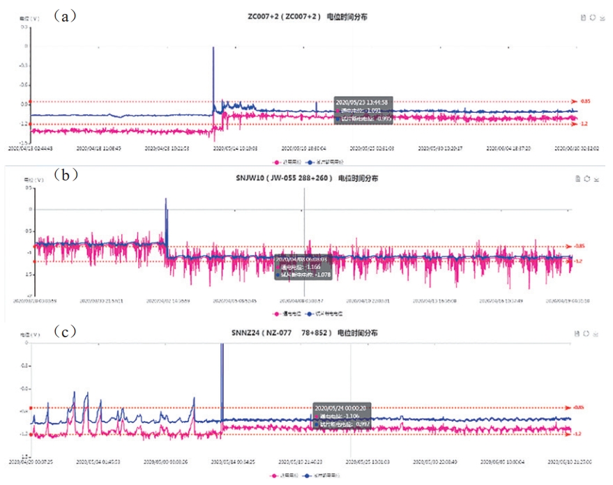 圖 3 a為SIM卡接觸不良問題整改前后通斷電電位變化情況。SIM卡接觸不良,將導(dǎo)致電位數(shù)據(jù)無法正常傳輸,整改后,重新上傳數(shù)據(jù)。圖 3 b為重新標(biāo)定采集儀前后通斷電電位變化情況。圖 3 c為更換采集儀前后通斷電電位變化情況,采集儀屬于智能測試樁的數(shù)據(jù)處理中樞,校準(zhǔn)或維修后電位值恢復(fù)正常。