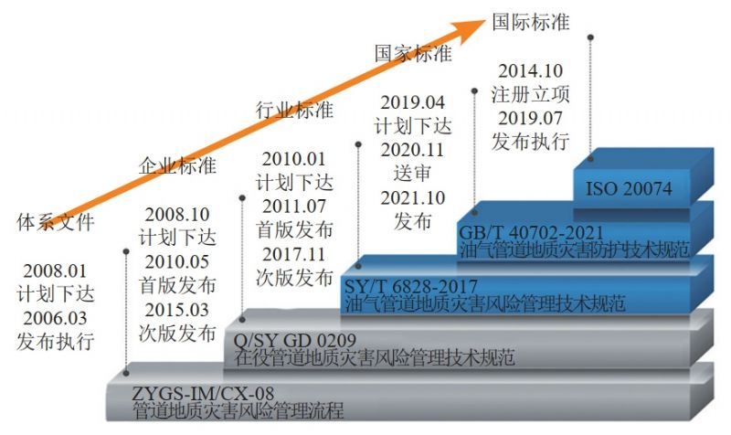 發(fā)展階段:從2008年開始,油氣管道行業(yè)系統(tǒng)開展管道地質(zhì)災(zāi)害領(lǐng)域標(biāo)準體系建設(shè)工作。經(jīng)過近15年的不懈努力,先后制定了SY/T 6828―2017《油氣管道地質(zhì)災(zāi)害風(fēng)險管理技術(shù)規(guī)范》、ISO 20074:2019《石油天然氣工業(yè)-陸上管道地質(zhì)災(zāi)害風(fēng)險管理》、GB 40702―2021《油氣管道地質(zhì)災(zāi)害防護技術(shù)規(guī)范》、ISO/CD 10903《管道地質(zhì)災(zāi)害監(jiān)測技術(shù)、程序與系統(tǒng)》(制定中)、ISO/TR 23154《土體運動引起的管道應(yīng)力檢測指南》(制定中)等一批國家、國際、行業(yè)及多項企業(yè)標(biāo)準為引領(lǐng)的系列標(biāo)準群,實現(xiàn)了該研究領(lǐng)域在國際、國家和行業(yè)標(biāo)準體系中的全覆蓋(圖 1)。